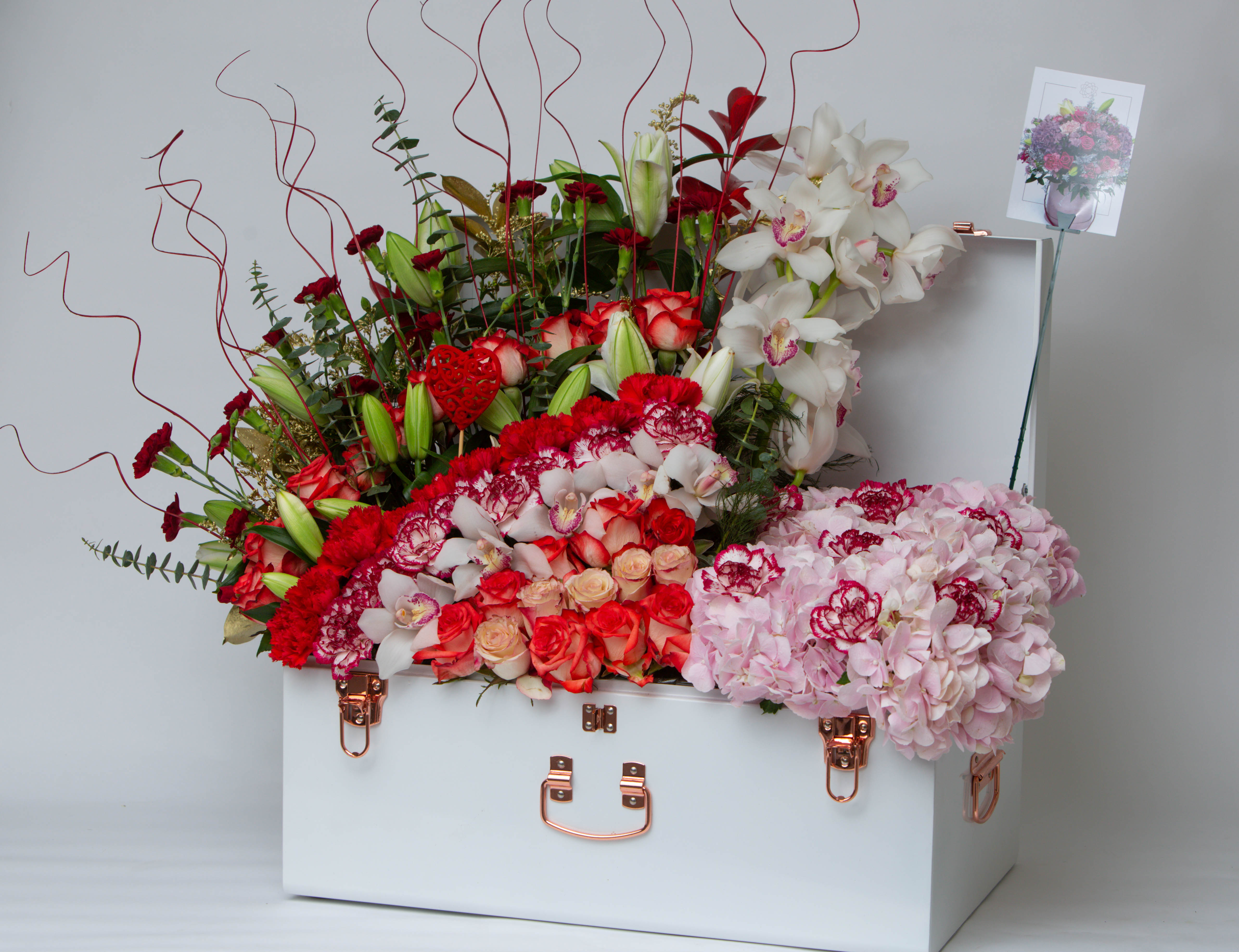 A beautiful mix of blue hydrangeas, yellow roses, green carnations etc